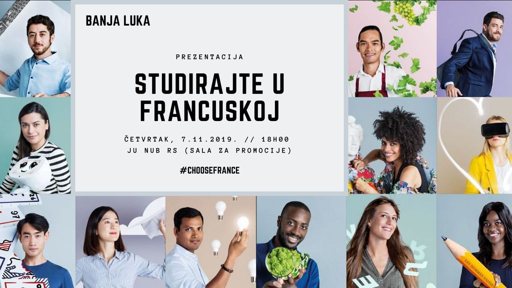 Stipendije i programiUniverzitet u Banjoj LuciFrancuski institut u Bosni i Hercegovini u saradnji sa JU Narodnom i univerzitetskom bibliotekom Republike Srpske organizuje predstavljanje studija u Francuskoj i stipendija Vlade Republike Francuske u četvrtak 7. novembra 2019. u 18:00 časova u JU NUB RS, u sali broj 29.