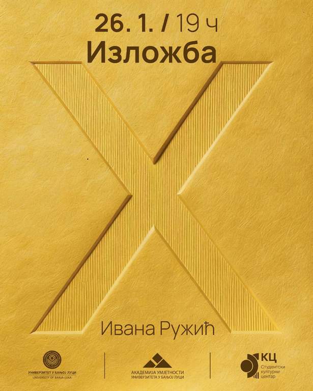 Univerzitet u Banjoj LuciOpšteIzložba „X” autorke Ivane Ružić, koja će biti otvorena 26. januara 2026. godine u 19.00 časova, označava početak izlagačke sezone Studentskog kulturnog centra Univerziteta u Banjoj Luci (SKC UNIBL) za akademsku 2025/26. godinu.