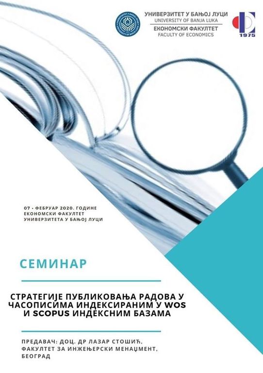 Наука и развојУниверзитет у Бањој ЛуциОпштеСеминар „Стратегије публиковања радова у часописима индексираним у WoC и Scopus индексним базама“ биће одржан 07. фебруара 2020. године на Економском факултету Универзитета у Бањој Луци, са почетком у 10 часова.