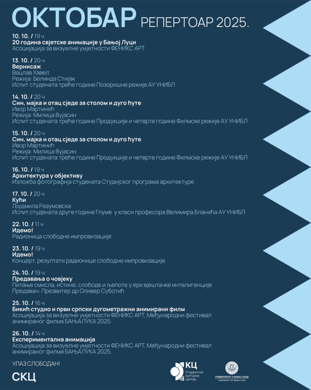 Универзитет у Бањој ЛуциОпштеСтудентски културни центар Универзитета у Бањој Луци (СКЦ УНБЛ) у октобру 2025. године доноси разноврстан и богат програм који ће љубитељима културе и умјетности понудити позоришне премијере, изложбе, филмске и анимационе програме, радионице, концерте и предавања.