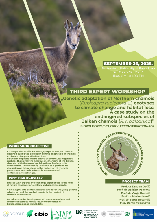 Универзитет у Бањој ЛуциОпштеУ оквиру међународног научноистраживачког пројекта „Генетска адаптација екотипова дивокозе (Rupicapra rupicapra L.) на климатске промјене и губитак станишта: Студија случаја о угроженој подврсти Балканска дивокоза (R. r. balcanica)ˮ, у петак, 26. септембра 2025. године, у 11.00 часова биће одржана трећа стручна радионица у сали 7 Ректоратa Универзитета у Бањој Луци.