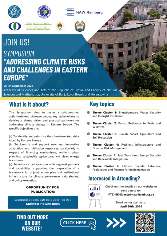 Наука и развојУниверзитет у Бањој ЛуциОпштеПриродно-математички факултет Универзитета у Бањој Луци и Академија наука и умјетности Републике Српске, у сарадњи са Истраживачко-трансферним центром „Одрживи развој и управљање климатским промјенама” Универзитета примијењених наука у Хамбургу, организују међународни симпозијум „Addressing Climate Risks and Challenges in Eastern Europe”.