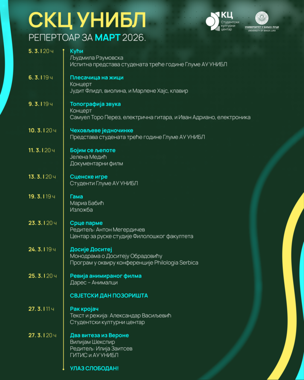 Универзитет у Бањој ЛуциОпштеОбјављен је репертоар за март 2026. године у Студентском културном центру Универзитета у Бањој Луци, који доноси богат програм позоришних представа, концерата, изложби и филмских пројекција.