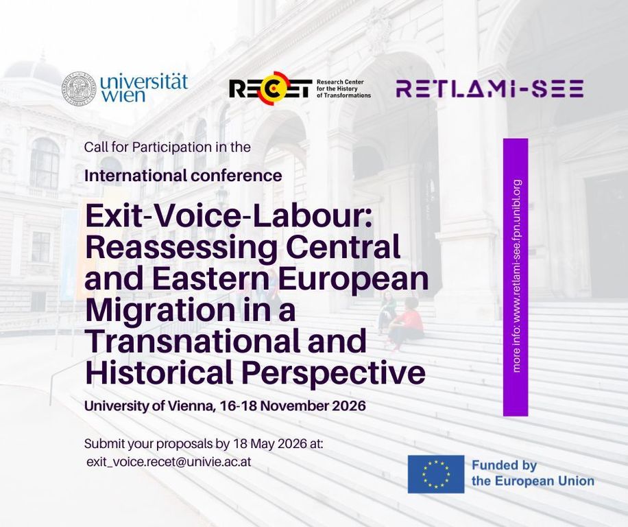 Наука и развојУниверзитет у Бањој ЛуциОпштеОтворен је позив за пријаву радова за учешће на међународној конференцији „Exit–Voice–Labour: Reassessing Central and Eastern European Migration in a Transnational and Historical Perspectiveˮ, која ће бити одржана на Универзитету у Бечу од 16. до 18. новембра 2026. године.